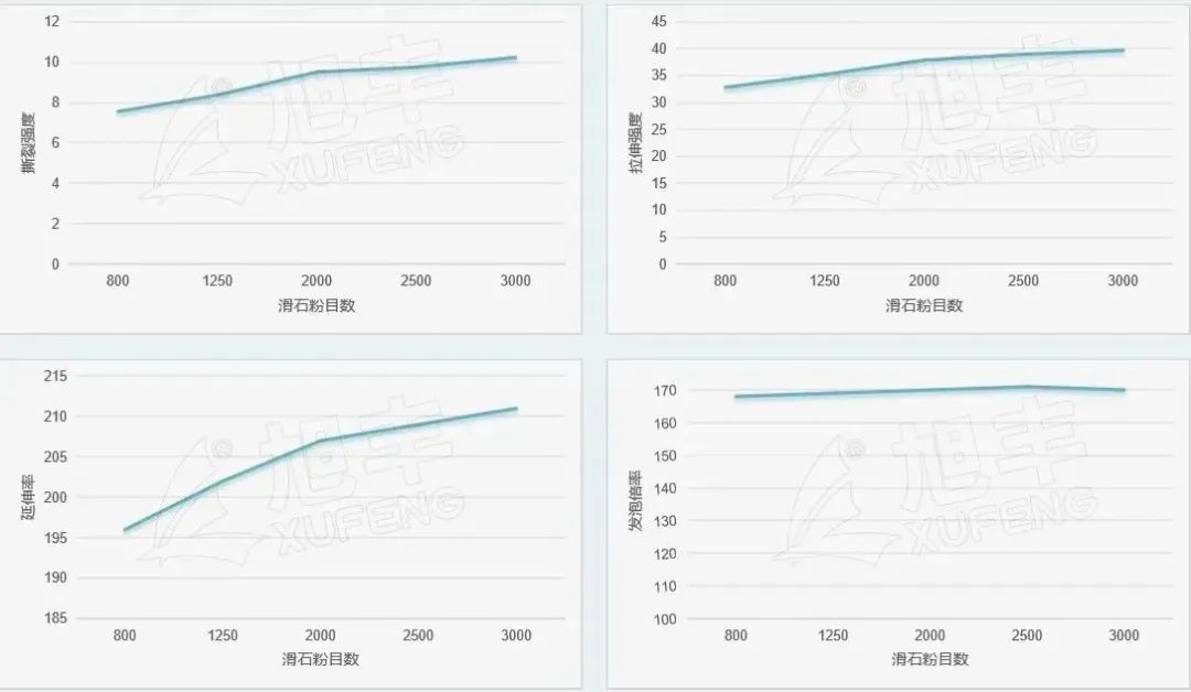 3、滑石粉的粒徑影響其強度,但2000目后,提升幅度較小,且較難分散,因此綜合成本及分散性考慮,選擇1250-2000目滑石粉最佳。