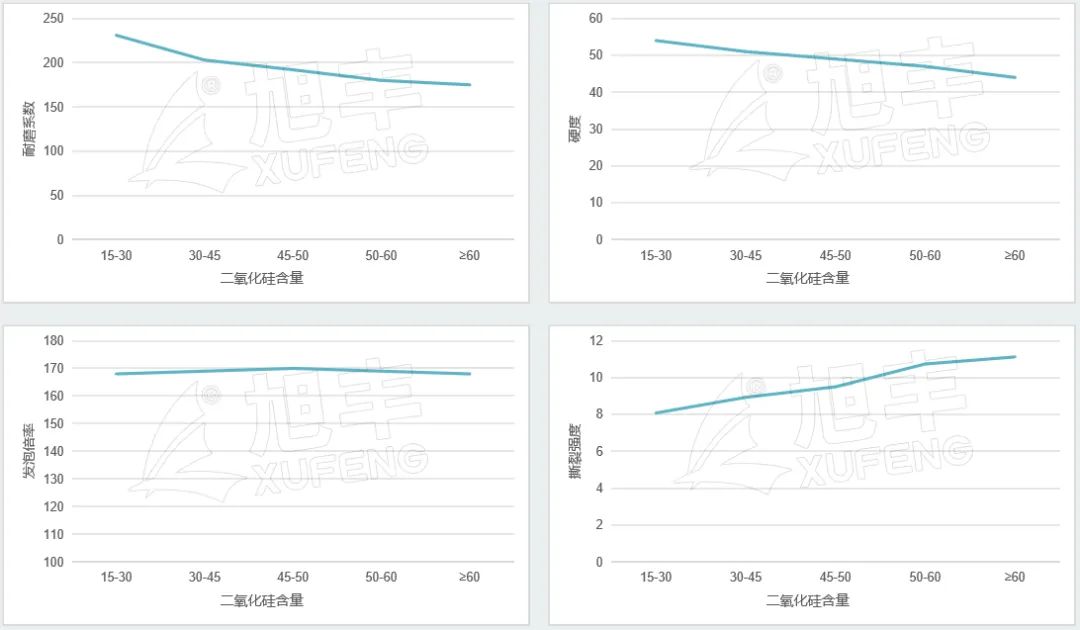 由于滑石粉具有較好的片狀結構,因此其填充后,EVA鞋材具有較好的耐磨性和撕裂強度,而二氧化硅含量越高的滑石粉,其耐磨性和撕裂強度便越高(耐磨系數越低,耐磨性越好);二氧化硅含量對于EVA鞋材的整體發泡倍率沒有明顯的差異,且硅含量較高的滑石粉整體填充后硬度較低,提供較好的彈性。